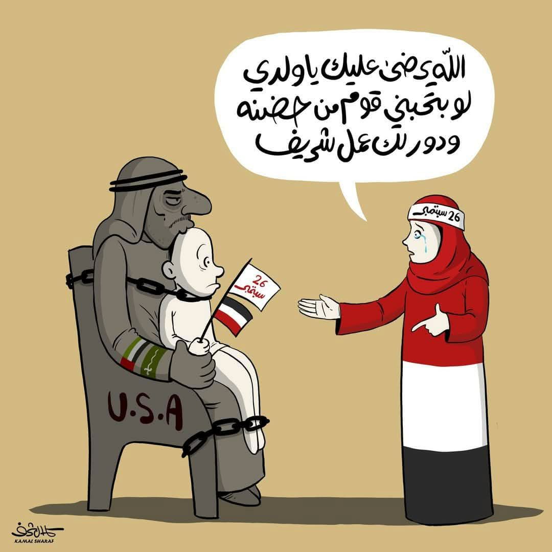 كاريكاتير معبر يجسد ثورة 26 سبتمبر كأم تخاطب أبنها العاق الذي يجلس في أحضان السعودية، تجسيد لمحاولات المرتزقة في تحويلها إلى محطة موسمية لبث سمومها السياسية والإعلامية وإثارة الفتنة :