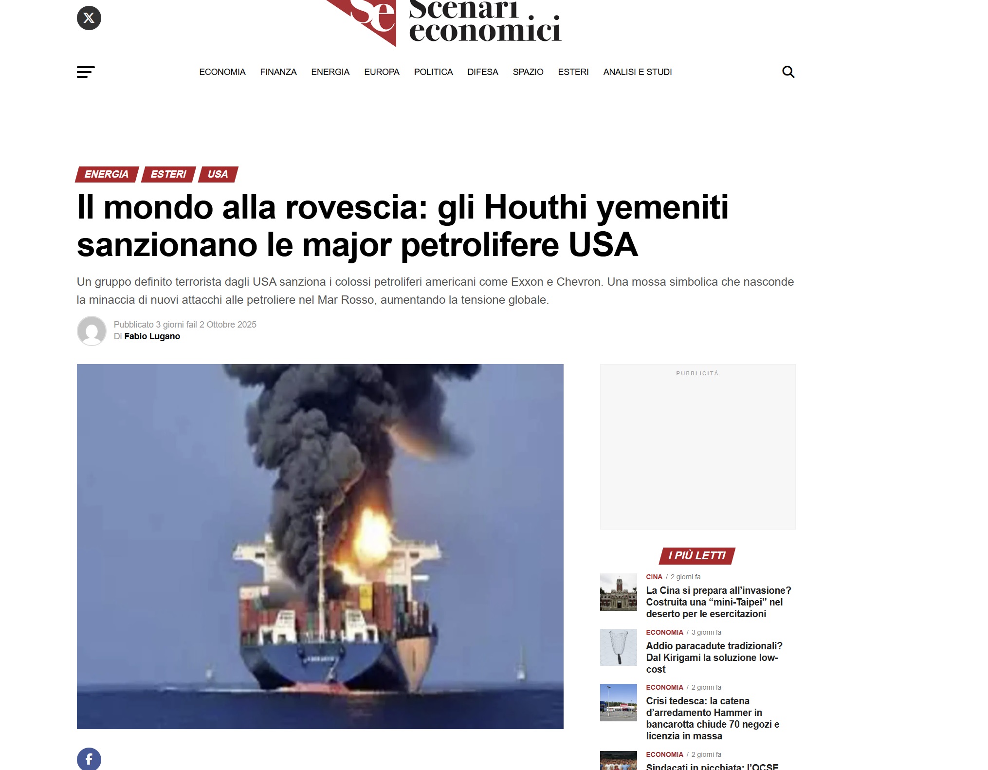 كشفت مجلة “سيناري إيكونوميك – Scenarieconomici” الإيطالية المتخصصة في تحليل القضايا الاقتصادية والسياسية والشؤون الدولية أن ” اليمن أعلن فرض عقوبات على كبرى شركات النفط الأمريكية، في مقدمتها “إكسون موبيل” و“شيفرون”، لتصبح اليمن أول دولة في المنطقة ترد على العقوبات الأمريكية بإجراءات معاكسة تطال قلب الاقتصاد الأمريكي ذاته”.