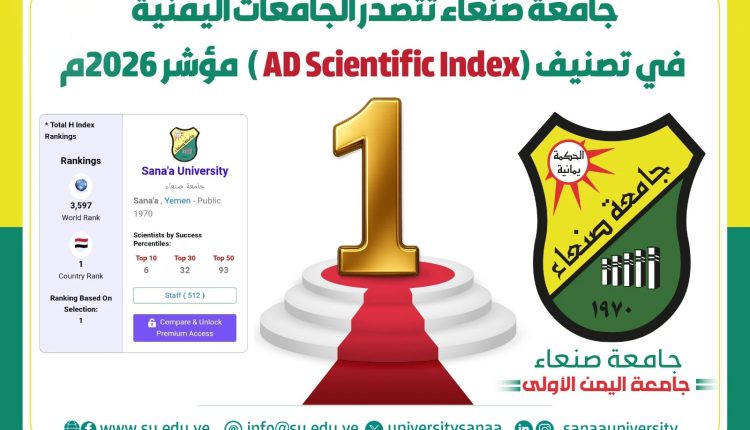 حققت جامعة صنعاء، إنجازًا علميًا عالميًا جديدًا، بعد أن تقدمت 459 مرتبة في قائمة التصنيف الدولي للبحث والنشر العلمي وفقًا لمؤشر AD SCIENTIFIC INDEX للعام 2025م.