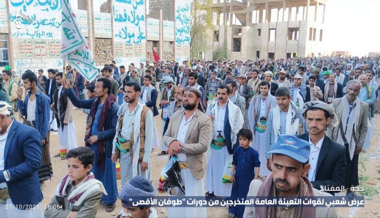 شهدت مديرية المفتاح بمحافظة حجة اليوم الاثنين ، عرضاً شعبياً مهيباً لخريجي الدورات العسكرية المفتوحة، وذلك بمناسبة الذكرى السنوية الثانية لعملية “طوفان الأقصى”.