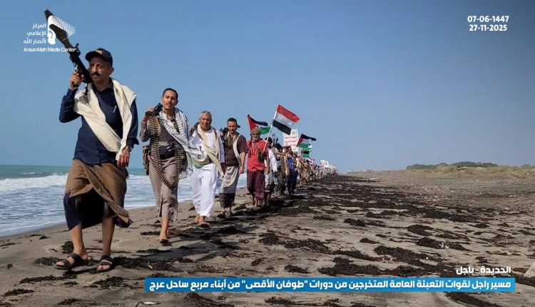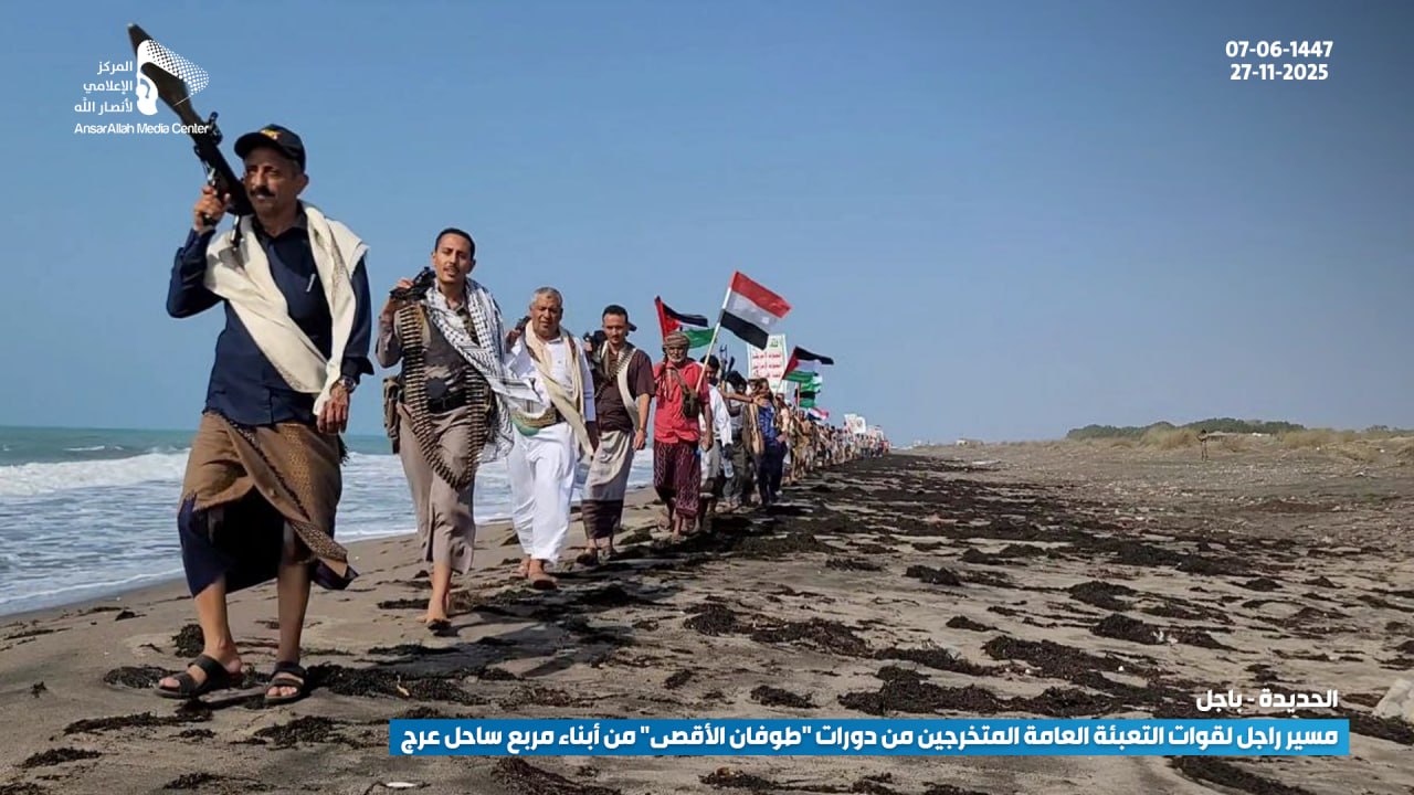 انطلق المسير، الذي نفذه 250 من الملتحقين بدورات التدريب والتأهيل العسكري، على امتداد الساحل البحري بمناسبة اختتام مشاركتهم في الدورة، مؤكدين التفويض للقيادة وتنفيذ كل الخيارات لنصرة فلسطين والجهاد في سبيل الله، والتصدي لأي محاولات من الغزاة المحتلين والمتربصين باليمن والأمة.