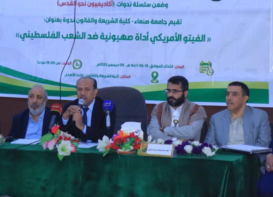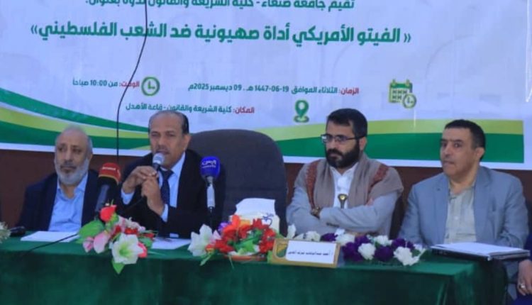 نظمت جامعة صنعاء اليوم بكلية الشريعة القانون ندوة فكرية بعنوان “الفيتو الأمريكي أداة صهيونية ضد الشعب الفلسطيني” ضمن سلسلة ندوات “أكاديميون نحو القدس”.