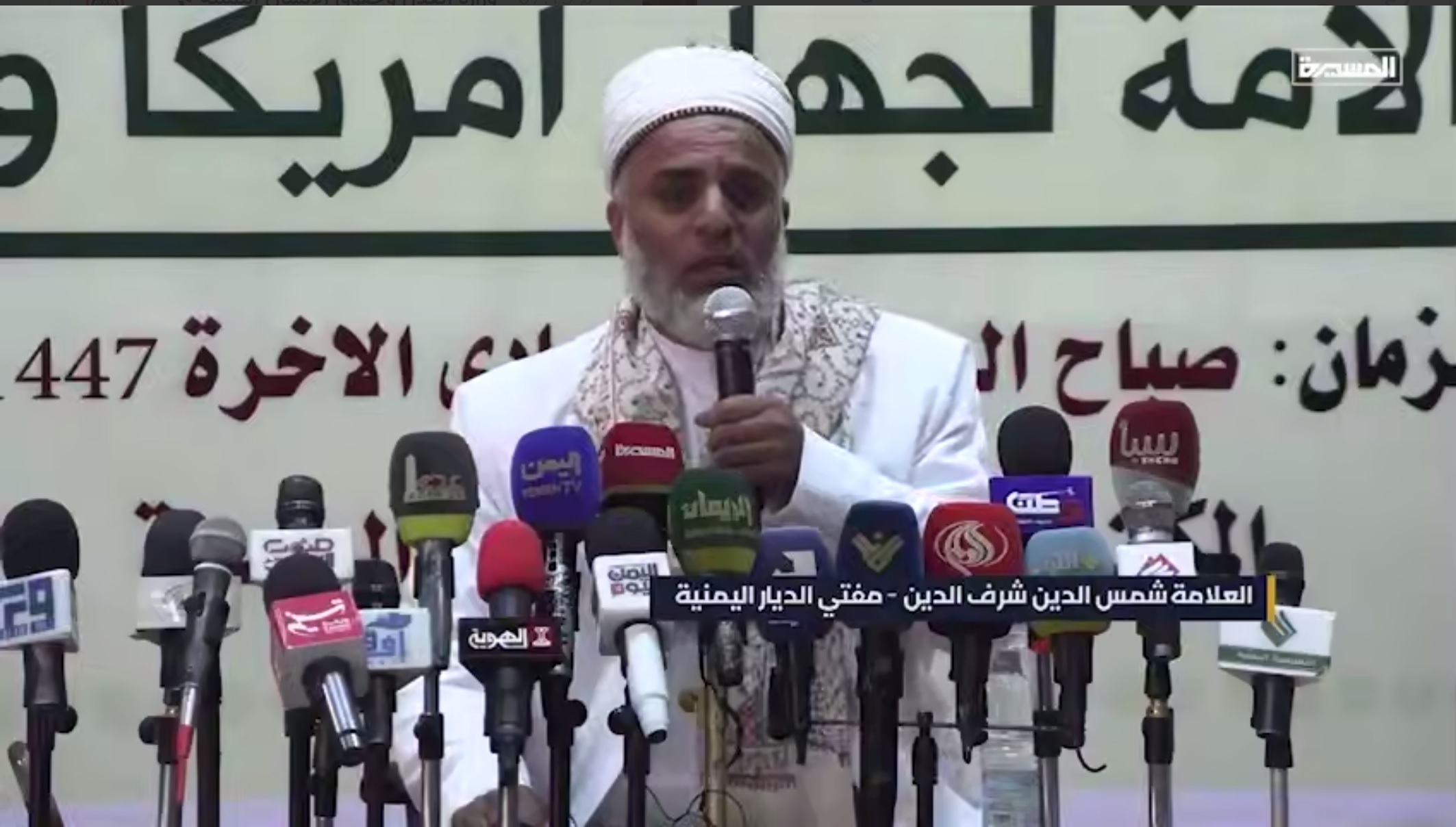 جاء ذلك في كلمة ألقاها مفتي الديار اليمنية شمس الدين شرف، اليوم السبت، في لقاء علمائي موسع بعنوان “مسؤولية العلماء في الانتصار لكتاب الله والمقدسات وتعبئة الأمة لجهاد أمريكا وإسرائيل”، نظمته رابطة علماء اليمن، غضبًا لكتاب الله ورفضًا للإساءة الأمريكية، الصهيونية إليه.