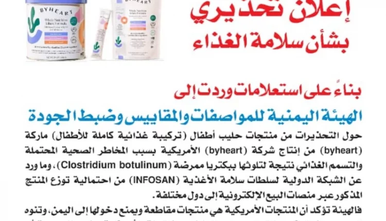 أصدرت الهيئة اليمنية للمواصفات والمقاييس وضبط الجودة، اليوم، تحذيرا من منتج حليب اطفال يحمل العلامة التجارية ByHeart امريكي المنشأ، بعد ثبوت تلوثه ببكتيريا خطرة من نوع Clostridium botulinum، لما يشكله من مخاطر صحية قد تصل الى التسمم الغذائي لدى الاطفال.