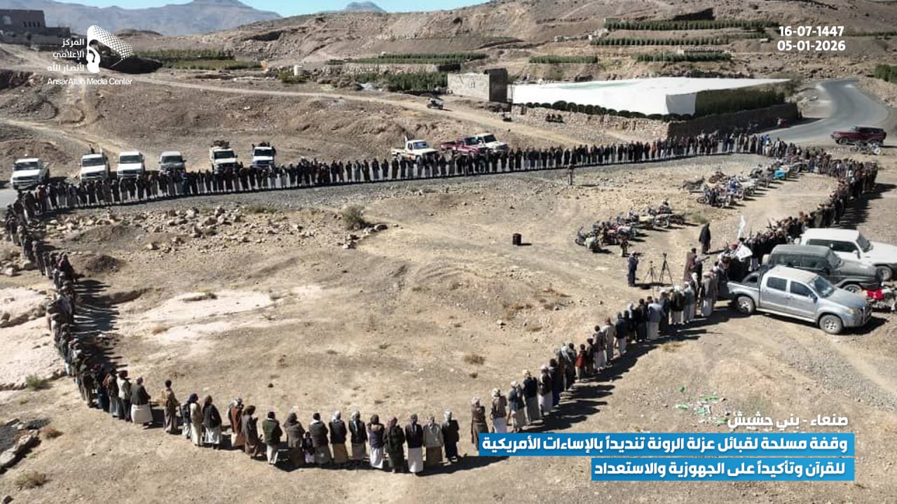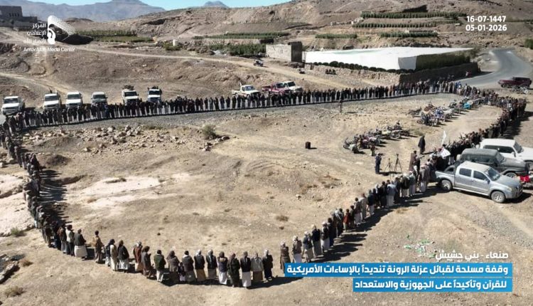 نظم أبناء عزلة الرونة بمديرية بني حشيش، محافظة صنعاء، اليوم الاثنين، وقفة قبلية مسلحة تنديدًا بجريمة الإساءة الأمريكية للقرآن الكريم، وانتصارًا لكتاب الله والمقدسات الإسلامية.