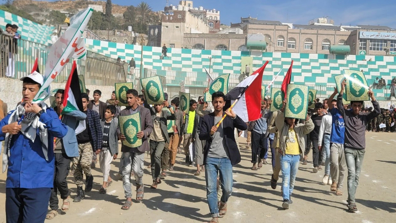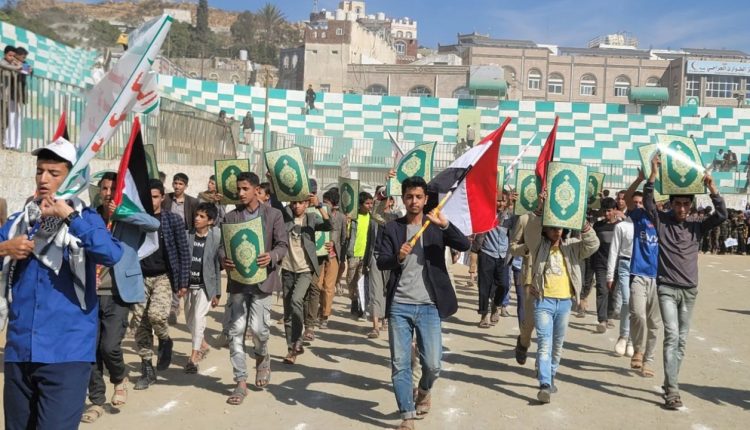 ورفع الطلاب القرآن الكريم والعلم اليمني والشعارات المناهضة للعدو الصهيوني الأمريكي والمساندة لقضايا الأمة وفي مقدمتها القضية الفلسطينية وارتباطهم بالو