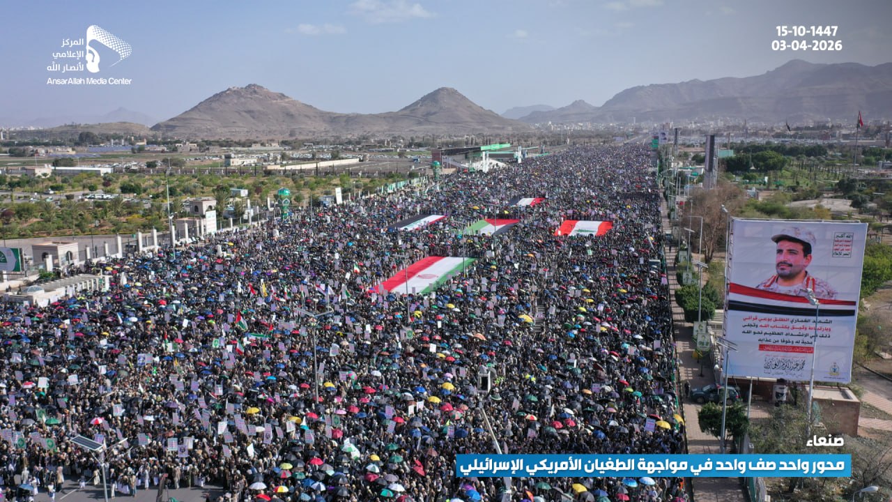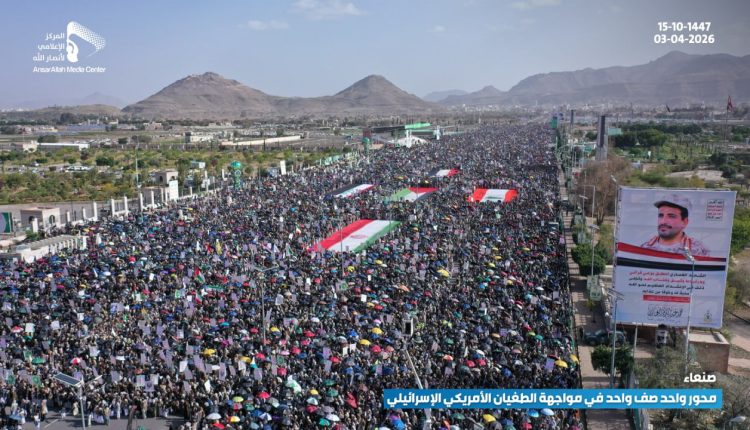 شهدت العاصمة صنعاء اليوم الجمعة، طوفانا بشريا في مليونية “محور واحد صف واحد في مواجهة الطغيان الأمريكي الإسرائيلي”، تأكيدا على وحدة الساحات وإسنادا لمحور الجهاد والمقاومة في مواجهة المخطط الصهيوني.