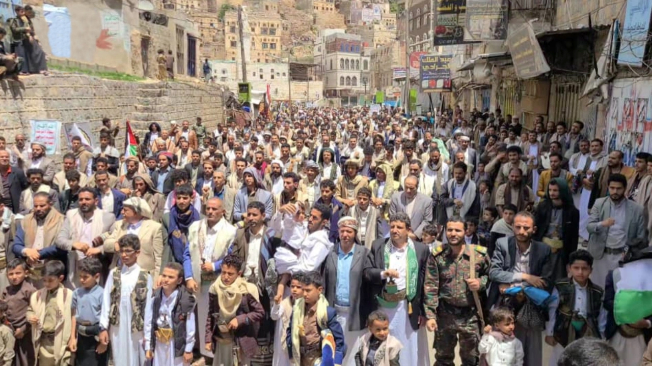 ورفع المشاركون في المسيرات والوقفات التي تقدّمها وكلاء المحافظة وقيادات محلية وتنفيذية وأمنية، بمركز المحافظة ومديريات الرجم، وشبام كوكبان، والطويلة، والخبت، وحفاش، وملحان، وبني سعد، أعلام اليمن وفلسطين ولبنان وإيران، ولافتات عبّرت عن التمسك بخيار المقاومة، والبراءة من أعداء الأمة.