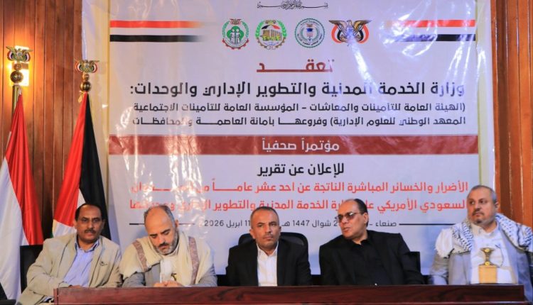 وخلال المؤتمر الصحفي في المؤتمر الذي حضره وكيلا وزارة الخدمة المدنية لشؤون الوظيفة العامة علي الكبسي والتنظيم وسياسات الموارد البشرية شكري عبدالمولى ورئيسا هيئة التأمينات والمعاشات إبراهيم الحيفي ومؤسسة التأمينات الاجتماعية شرف الدين الكحلاني، وعميد المعهد الوطني للعلوم الإدارية الدكتور محمد القطابري، استعرض مدير مكتب وزير الخدمة المدنية جمال المسني الأضرار والخسائر الناتجة عن العدوان الأمريكي، الأمريكي على الوزارة ومكاتبها في المحافظات.