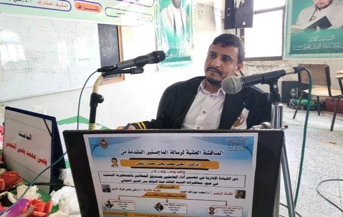 حصل الباحث يحيى محمد النعمي على درجة الماجستير بامتياز من قسم العلوم التربوية والنفسية من كلية التربية والعلوم الإنسانية بجامعة حجة عن رسالته الموسومة بـ “دور القيادة الإدارية في تحسين أداء العاملين بصندوق المعاقين بالجمهورية اليمنية في ضوء محاضرات السيد القائد عبدالملك بدر الدين الحوثي”.